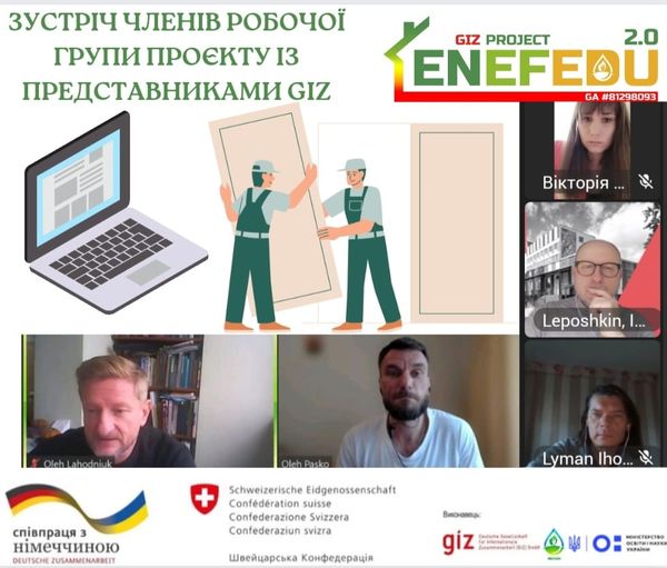 В рамках проєкту № 81298093 «Енергоефективний навчальний заклад. Термомодернізація закладів П(ПТ)О у рамках розроблених курсів енергоефективності. 2.0» #GIZ_ENEFEDU2.0, що здійснюється Благодійний фонд Людина / Charity fund Human за підтримки Міністерство освіти і науки України та технічної підтримки Deutsche Gesellschaft für Internationale Zusammenarbeit (GIZ) GmbH Energy Efficiency and Climate Projects в межах більшого проєкту «Просування енергоефективності та впровадження Директиви ЄС з енергоефективності в Україні» (FEER) та фінансується Федеральним міністерством економічного співробітництва та розвитку Німеччини (BMZ), відбулась зустріч членів робочої групи проєкту та представників Deutsche Gesellschaft für Internationale Zusammenarbeit (GIZ) GmbH.